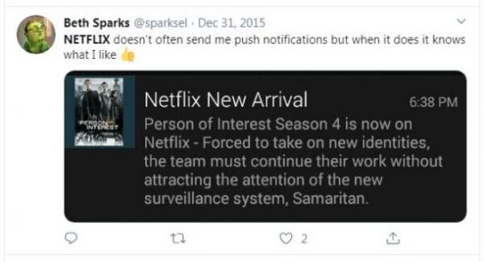 일단 브랜드가 고객의 정보를 수집하면 푸시 알림은 그 고객이 결코 넷플릭스를 잊지 못하게 만들 것입니다. 그 밀고 당기는 푸시 알림은 결코 강제적이지 않습니다. 오히려 고객들은 오히려 더 많은 알림을 원할 것입니다. 넷플릭스의 한 팬이 이런 브랜드의 푸시 알림 전략을 언급한 트윗 내용을 살펴보세요.