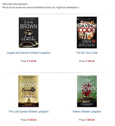 만약 여러분이 아마존의 오랜 고객이라면 어느 순간 아마존이 매 순간 지켜본다는 것을 느끼셨을 것입니다. 그렇지 않으면 최근에 검색했던 제품에 관해 아마존으로부터 이메일을 받은 적이 없었을 것입니다. 예를 들어 아마존에서 댄 브라운의 『다빈치 코드』라는 책을 구매했다면 3일 후에 다음과 같이 같은 시리즈에 포함된 책 리스트가 있는 이메일을 받게 됩니다.