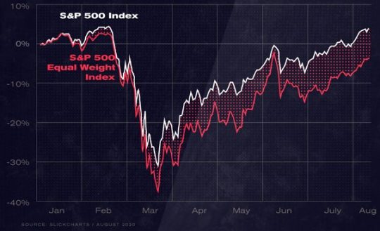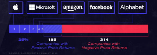 이러한 단절은 S&P 500 기업들이 올리는 매출의 지리적 원천뿐 아니라, 이들이 지수에서 차지하는 시가총액 가중치로 설명할 수 있다. 개인의 일상에서 가장 눈에 띄는 기업들은 주식시장에서 미미한 부분을 차지하는 동시에 작고 취약한 곳들이다. 그들이 아무리 몸부림을 치더라도, 주식시장 전체에 미치는 영향은 미미하다.