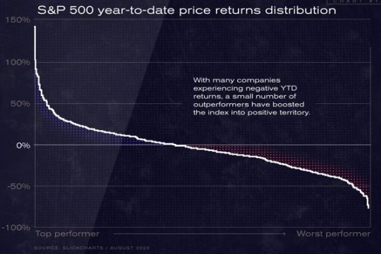 S&P 500을 구성하는 505개 종목 중 연초 대비 플러스(+) 수익률을 기록 중인 곳은 3분의 1 정도에 불과하며, 나머지 종목은 마이너스(-)였다.