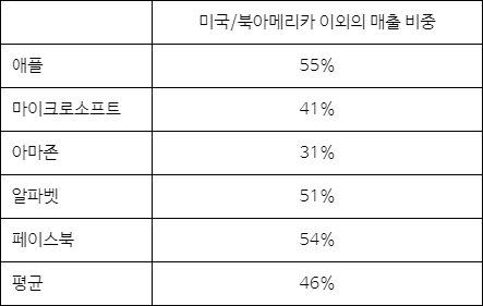 세계화 시대에 미국 기업들은 그 어느 때보다 지리적 다각화를 진행한다. 그들의 매출 흐름은 전 세계적으로 퍼져 있으며, 미국 국내에서의 매출이 과거보다 중요하지 않게 되었다. 예를 들어, S&P 500 기업들의 2018년 해외 매출 비중은 42.9%이며, 빅 테크 기업들은 이보다 더 높다.