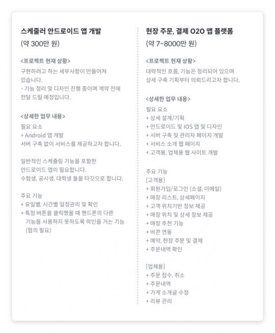 위시켓에 등록된 2건의 프로젝트를 비교해서 설명해드리겠습니다. 좌측 프로젝트는 ‘스케줄러 앱’ 제작 건이고, 우측 프로젝트는 스타벅스의 사이렌 오더처럼 앱으로 주문/결제를 하면 특정 음식점에서 음식을 받을 수 있는 ‘O2O 앱 플랫폼’ 개발 건입니다.
