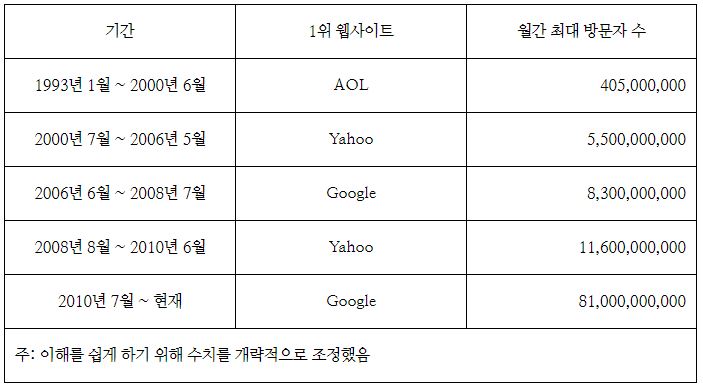 웹은 지난 몇 년간 급격하게 변화했지만, 상위권 웹사이트들은 비교적 일관성을 유지해왔다. 아래 표는 1993년 이래 트래픽이 가장 많은 웹사이트와 방문자 숫자를 보여준다.