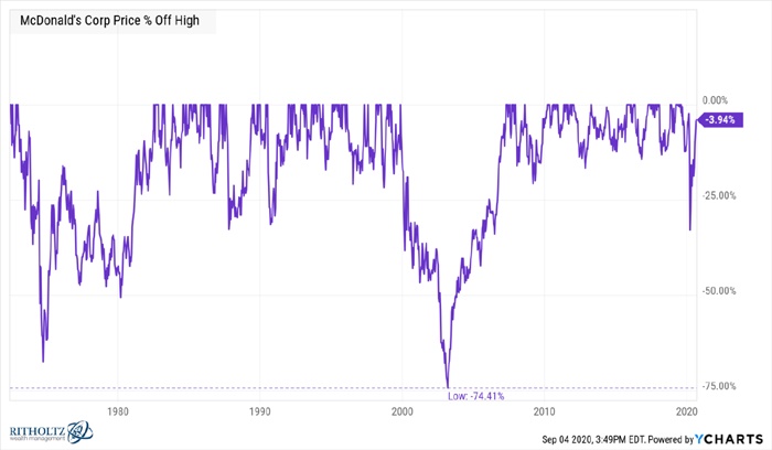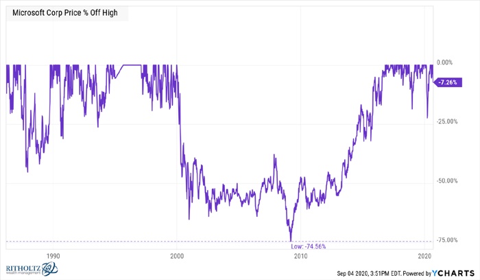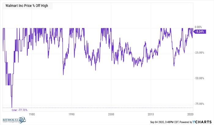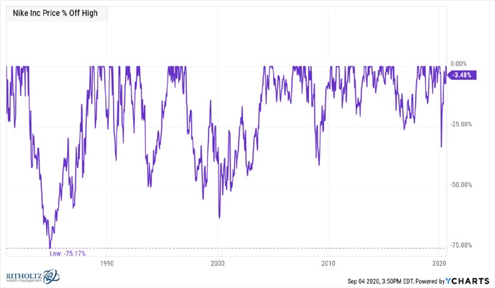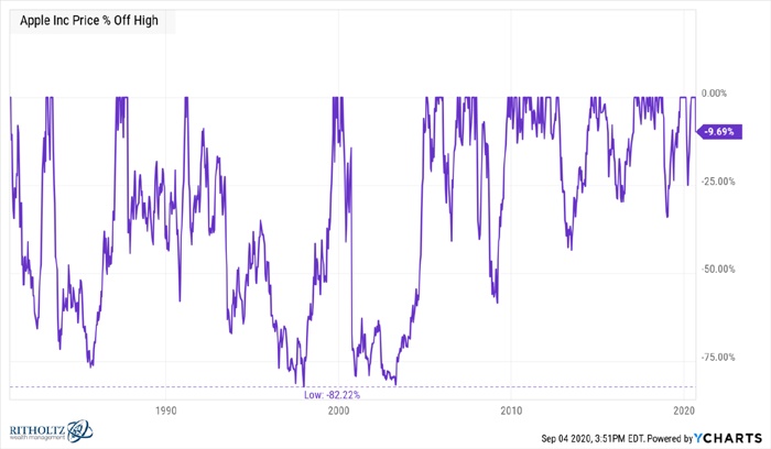 애플은 1980년대 초 이후 거의 120,000%(연간 19.5%) 상승했다. 하지만 그 과정에서 3차례에 걸쳐 75% 이상 폭락을 했으며, 십여 차례 이상 50% 이상 폭락을 경험했다.