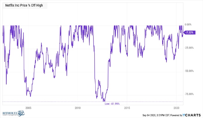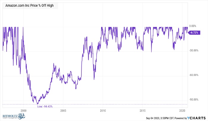 아마존은 모든 사람들이 가장 많이 "IPO 당시 1만 달러를 투자했다면…"이라고 상상해보는 종목이다. 실제로 1997년 이후 거의 170,000%(연간 38%) 상승했다. 하지만 거의 95%라는 최악의 폭락을 겪기도 했다. 그 이후로도 30% 하락도 여러 차례 경험했다.