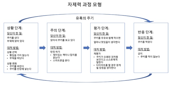 구체적인 내용으로 들어가기 앞서, 미국의 심리학자 안젤라 덕워스와 그녀의 동료들이 제안한 “자제력 과정 모형(the process model of self-control)”을 봅시다. 이 도표는 유혹의 형태에 따라 어떤 자제력 전략을 사용해야 하는지를 보여줍니다. 여기서 유혹의 형태란, 우리가 그 유혹에 대해 구체적으로 행동하기 전에 겪어야 하는 단계별 형태를 말합니다. 아래의 그림을 봅시다.