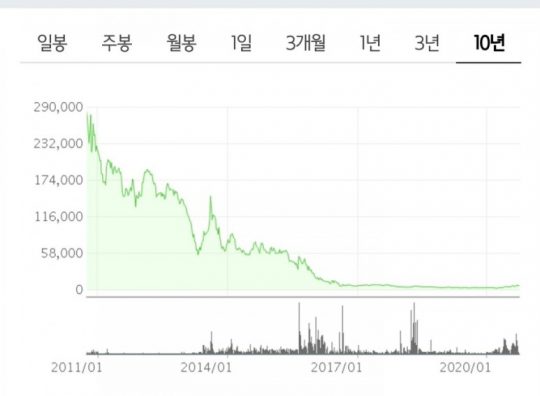 비싸게 판다 = 비싸지지 않으니 팔지 않는다문제는 '싸게 산' 가격에서 반 토막이 나더라도 손절하지 못하는 데서 발생한다. 비싸지면 팔려고 했는데 '비싸지지 않았기' 때문에 아무것도 하지 않는다. 반등의 미련이 생길 때면 현대상선 10년 그래프를 참고하자.