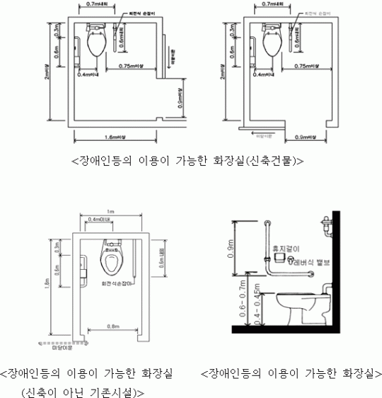 화장실 변기 옆 손잡이 높이, 레버식 밸브, 출입구의 문은 미닫이문에 대한 지침이다. 높이는 휠체어 사용자들의 편의에 맞춘 것 같고, 출입구 문은 여닫이로 할 경우 휠체어 사용자들의 불편하기에 미닫이문으로 정해놓은 것 같다. 이외에도 화장실 출입구에는 안내표지판을 부착해야 하고 시각장애인을 위해 점자 표지판을 함께 부착해야 한다. 이에 대한 높이에 대한 규정도 있다.
