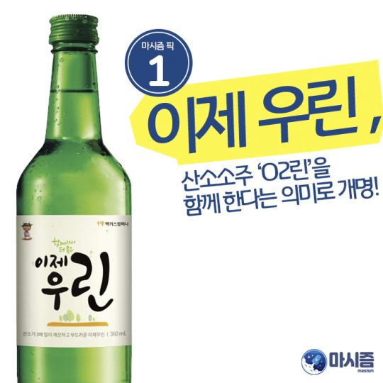 하지만 최근에는 순위가 바뀌었다. 바로 충청지역의 소주 ‘이제 우린’이다. 이전까지 이름은 ‘O2린’이었다. 산소가 많이 들어 있어서 빨리 깬다는 의미에서 지은 이름이었다. 이 녀석이 2018년부터 이름은 ‘이제 우린’으로 바꾸게 되었다. 언뜻 ‘O2린’과 폰트나 모습이 비슷해서 이벤트로 바꿔본 것인 줄 알았다.