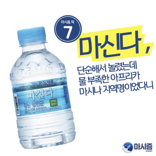 이는 강신호 회장이 아프리카를 다녀온 후 물이 부족한 ‘마시나(Masina)’라는 지역명에서 어원을 가져왔다고 한다. 우리가 흔하게 마시는 물 한 모금에도 소중함과 고마움을 생각하자는 의미를 담았다고 한다…고 말하니까 뭔가 음료판 탈룰라(놀리고 싶지만 놀릴 수 없는 사연을 가진 것)에 빠졌다.
