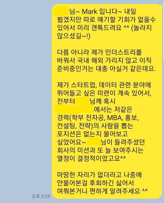 스타트업 이직을 정말로 포기해야 할지 심각하게 고민하던 어느 날 대표님이 떠올랐다. 등잔 밑이 어둡다고 했던가. 고민은 길게 하지 않았다. 이번이 아니면 '스타트업'에 대한 도전은 더 이상 없을 것이라는 걸 알았기 때문이다. 그리고 당돌하게도 대표님에게 카톡을 보냈다.