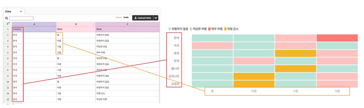 위는 간단하게 히트맵 차트를 만들어 본 예시입니다. 한국, 미국 등 7개의 나라에서 봄, 여름, 가을, 겨울 4계절 화재 위험이 얼마나 되는지를 히트맵으로 나타내 보았습니다. 이때 각 나라가 Y축, 계절이 X축이 되고 전체 칸수는 7*4=28개입니다. 위험도는 위험하지 않음, 적당한 위험, 매우 위험, 위험 감소의 4단계로 나타냈고 단계에 따라 다른 색상을 사용했습니다.