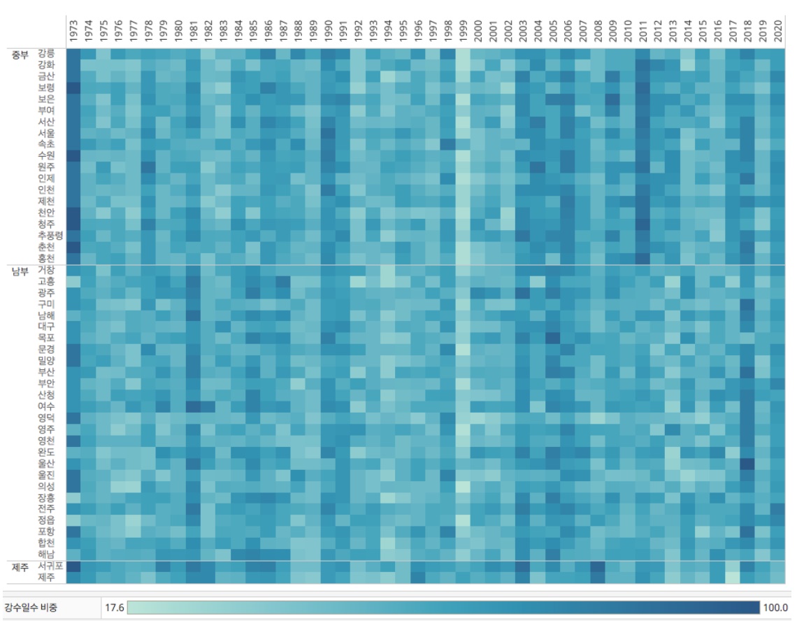 1973년부터 2020년까지의 기상 데이터를 시각적으로 분석해 여러 차트를 보여드렸는데, 그때 단연 많은 관심을 받았던 것이 위의 히트맵 시각화였습니다. 1973년 이후 강수일수를 각 지역(Y축)별로 나누고, 그 정도를 색의 진함 정도로 표현했습니다.