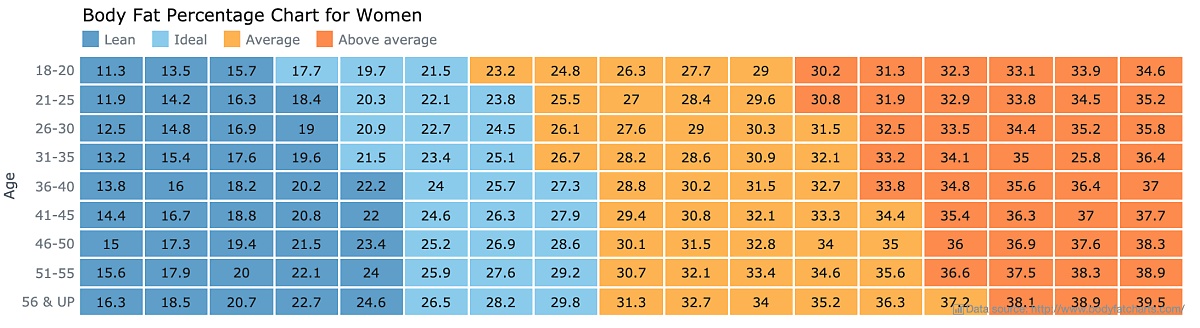 위 차트에는 2가지의 범주가 있습니다. 우선 Y축은 연령대를 나타냅니다. 이 범주는 구간이 18-20, 21-25…51-55, 56&up으로 나누어져 있는데, 이는 시각화 작성자가 필요에 따라 간격을 다르게 한 것입니다. 또 두 번째 범주인 X축이 의미하는 각 색상(Lean, Ideal, Average, Above average)역시 연령별로 기준이 다릅니다. 예를 들어 체지방률이 20%인 경우, 18-20세 사이에서는 Ideal한 체형이지만 36-40세라면 마른 편으로 구분이 되는 것이죠.