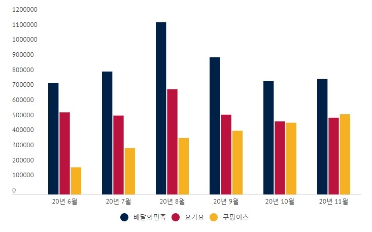 냉정히 말해, 요기요는 현재 엄청난 위기에 직면해있다. 선두주자 배민은 따라잡기 불가능할 만큼 멀리 달아난 반면, 강력한 추격자 쿠팡이츠가 어느덧 턱 밑까지 쫓아왔기 때문이다. 요기요의 형제 서비스 배달통은 이미 위의 점유율 그래프에서 보이듯이 경쟁에서 탈락한 지 오래이다.사실 올해 초 쿠팡이츠가 무서운 성장세로 배달통을 제칠 때까지만 해도, 요기요는 여유가 있었다. 요기요와 쿠팡이츠 사이에는 여전히 엄청난 격차가 있었기 때문이다. 하지만 지난 6월만 해도 MAU가 요기요의 1/12에 불과했던, 쿠팡이츠가 11월 기준으로는 1/4 수준까지 따라잡았다. 쿠팡이츠는 이처럼 정말 말도 안 되는 성장세를 보이며 지금 이 순간도 진공청소기처럼 신규 고객을 빨아들이고 있다.