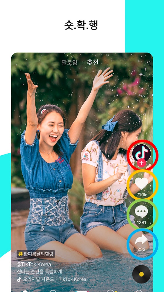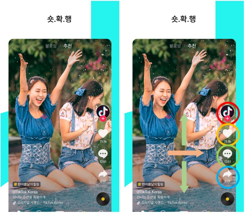 마지막으로, 넛지 기능인 '공유'가 제일 우측의 하단 모서리에 배치되어 있습니다. 이 기능을 통해 쉽게 틱톡의 영상을 외부 세계로 뻗어 나가게 만들 수 있습니다. 틱톡이 다른 채널과의 교류와 수용도 쉽게 할 수 있도록 만든 것이죠.