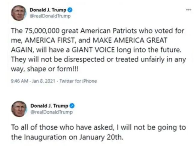 트럼프 대통령이 사용한 말들을 트위터의 “폭력 미화 및 선동 방지 원칙”에 비춰봤을 때 이 트윗들은 해당 조항을 위배한 것으로 판단됐고, 우리는 원칙대로 트럼프 대통령의 트위터 계정을 영구히 정지시켰다.