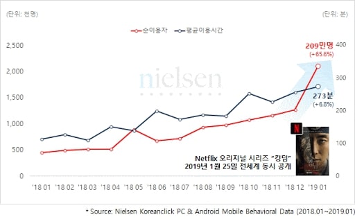 이처럼 야구는 투수놀음이란 말이 있듯이, 콘텐츠 시장은 결국 IP 싸움일 수밖에 없다. 넷플릭스가 국내 시장에서 성공을 거둔 것도 솔직히 8할은 잘 만든 콘텐츠 드라마 '킹덤' 덕분이었다. 국내 진출하고도 한동안은 지지부진하던 가입자 수 추이가 2019년 '킹덤'의 릴리즈 이후 1년 사이 3배나 증가하며, 안정적인 추세에 올랐기 때문이다.