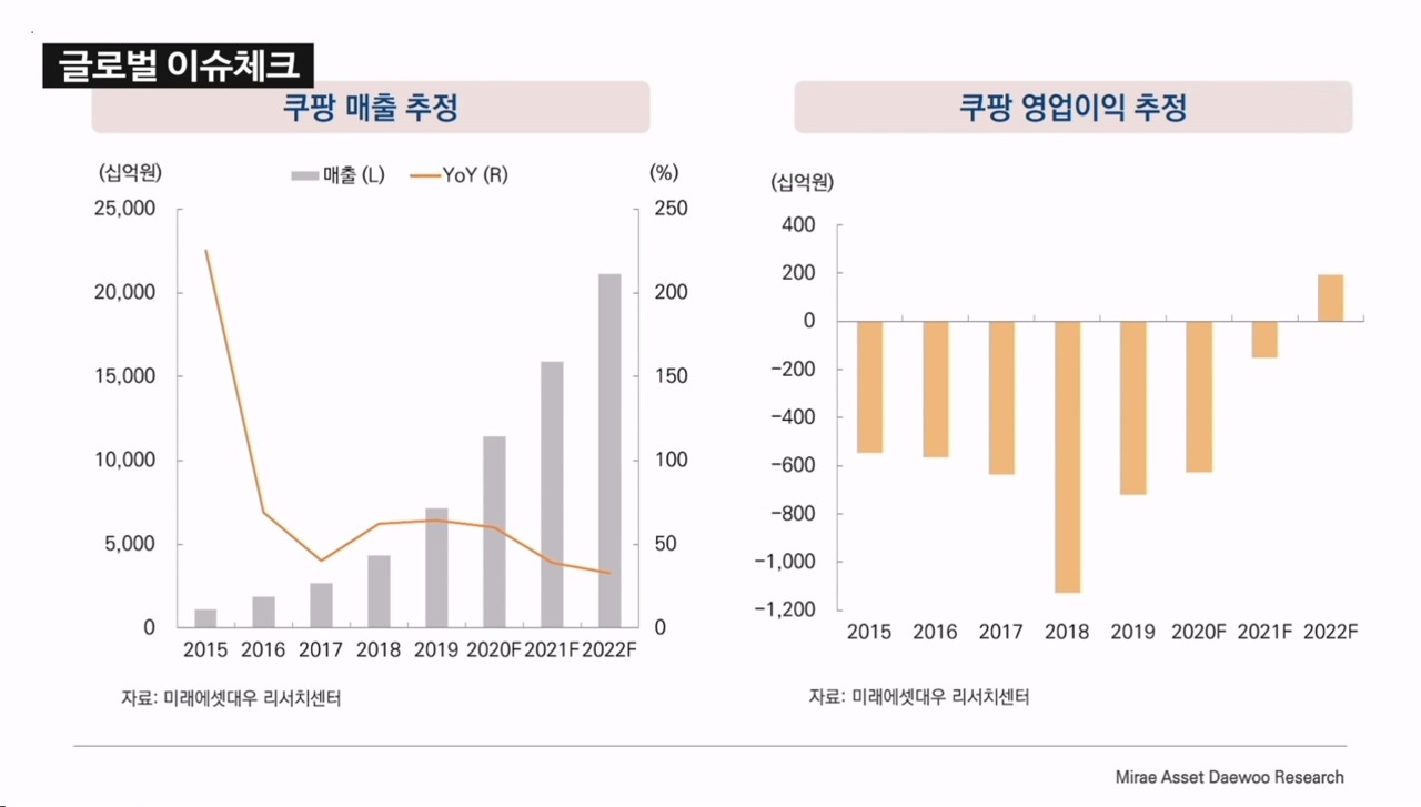 쿠팡은 그동안 거래액을 원하는 수준까지 늘리기 위해 정말 갖은 애를 써왔는데요. 18년도에는 로켓와우 멤버십을 만들었고요. 19년에는 스스로 박차고 나왔던 네이버 쇼핑에 다시 입점하기도 했습니다. 하지만 여전히 목표까지는 갈 길이 멀어 보였습니다. 그런데 쿠팡이 그토록 원하던 규모의 경제 구현이 때아닌 이커머스 호황으로 시기가 갑자기 앞당겨진 셈입니다. 이 덕택에 일각에서는 쿠팡이 작년까지는 어쩔 수 없이 대규모 적자를 보이겠지만, 올해 큰 폭으로 개선하고 내년쯤이면 흑자전환까지 가능할 것으로 전망하고 있습니다.