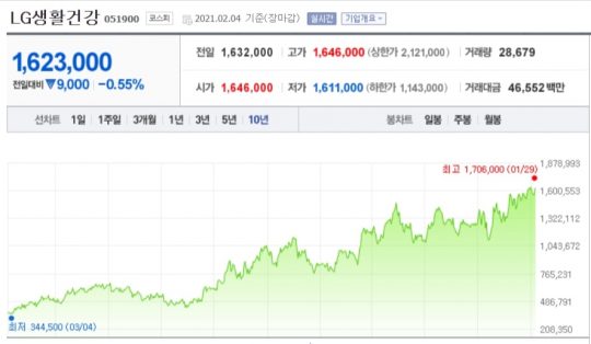 회사의 강력한 실적을 바탕으로 주가도 꾸준히 올라주며 2010년 3월 약 34만 원 수준이던 LG생활건강의 주가는 10년 만에 약 160만 원 수준으로 오르며 주주들에게 470%의 수익률을 선사하기도 했다.