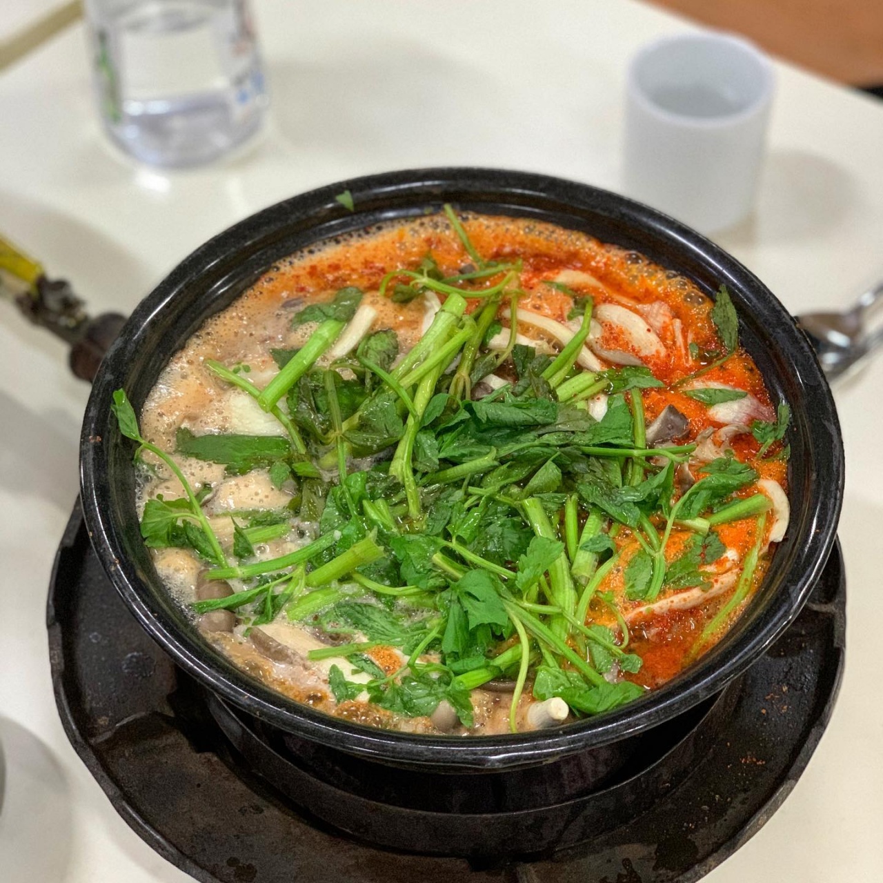 펄펄 끓는 육수에 데쳐진 미나리와 버섯으로 입맛을 돋운 뒤 칼국수 사리를 넣어 진득한 국물을 맛보고 마지막에는 볶음밥으로 든든하게 마무리하면 된다. 미나리, 버섯, 면사리를 추가해 푸짐함을 더해도 좋다.