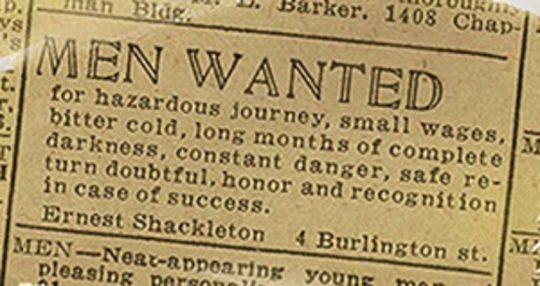 당시는 교과서에도 나오는 ‘아문센’과 ‘스콧’이 누가 먼저 남극점을 찍고 탐험왕이 될 것인가 경쟁하던 대남극의 시대였다. 1907년 아깝게 도전에 실패했던 섀클턴은 다시 한번 탐험대를 꾸리기로 하며 신문에 역사적인 모집 광고를 냈다.