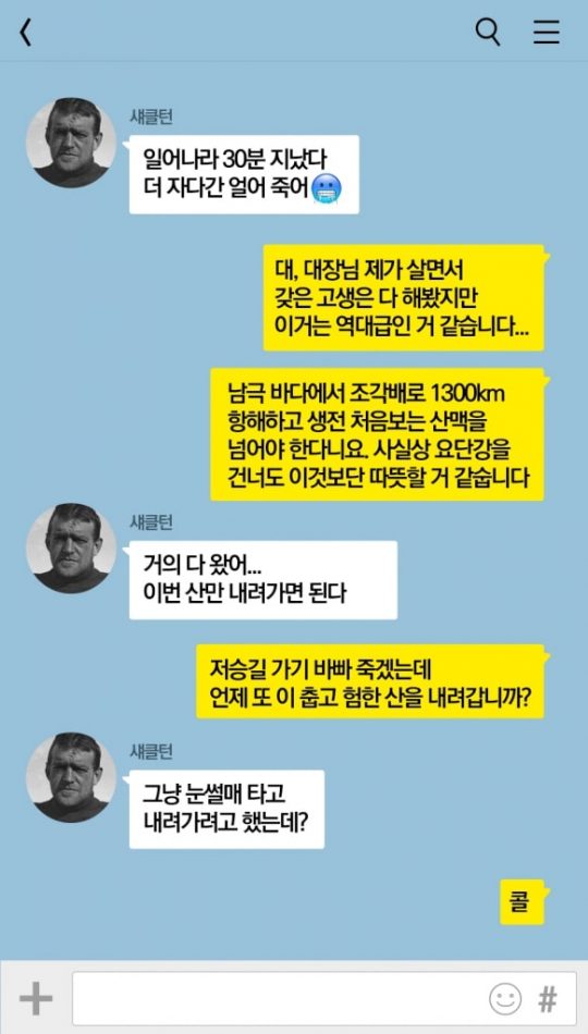 섀클턴은 위기 속에서도 리더십을 발행했다. 좋은 품질의 침낭을 두고 제비뽑기를 할 때 사기를 쳐서(?) 일반 대원들에게 모두 좋은 침낭을 쓰게 했다. 그래고 브리테니커 사전을 불쏘시개로 쓰면서 연료를 아꼈다. 하지만 냉장고 같은 환경 속에서 도움의 손길을 기다릴 수만은 없었다.