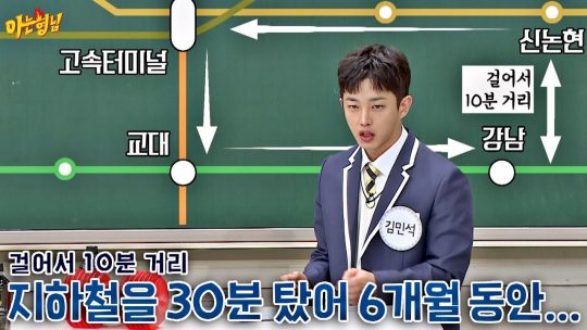 부산 출신 배우 김민석이 서울에 갓 상경했을 때의 에피소드를 방송에서 본 적 있다. 아르바이트 자리를 2호선 강남역 근처에서 구했고, 집은 9호선 신논현역 근처에 얻었는데 이 거리가 걸어가면 십 분 내외인 걸 몰라서 매일 지하철을 탔다고 한다. 심지어 환승까지 하느라 삼십 분씩 걸려가며 출퇴근을 했는데 반년이 지나서야 그간 얼마나 황당한 행동을 해왔는지 알게 되어 허탈했다는 이야기를 하자 듣고 있던 사람들이 깔깔댔다. 그걸 알려주는 사람 하나 없었느냐며.