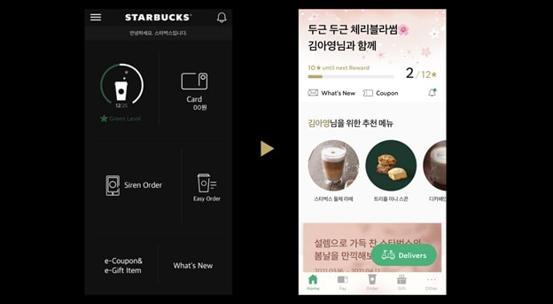 밝은 녹색의 스플래시 스크린은 ‘앱이 업데이트됐구나’의 스포일러 정도에 불과했다. 사이렌 오더를 애용하는 모든 스벅 고객들은 그렇겠지만 제법 놀랄 만한 변화다. 왼쪽이 이전의 메인 화면이고 오른쪽이 리뉴얼된 앱의 메인 화면인데, 정보 구조부터 인터페이스의 분위기가 크게 변화한 것을 볼 수 있다.