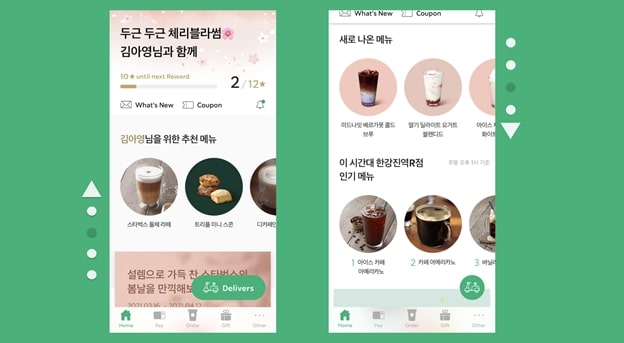 위의 이미지와 같이 내가 주문했던 커피 데이터를 토대로 추천 메뉴를 상단에 띄워주고 하단에는 프로모션 리스트를 제공하고 있다. 이커머스의 전형적인 정보 구조를 차용하고 있는 데다 배달(Delivers) 메뉴까지 플로팅 버튼으로 제공하여 ‘커피 주문 앱’으로서의 정체성이 공고해진 느낌이다.