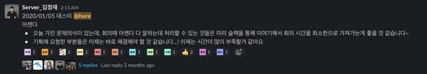 사소한 것 같지만, 이러한 기능이 없을 경우 상대방의 반응을 쉽게 알 수 없으며 반응하려고 해도 텍스트로 작성하기에 폼이 든다. 간단한 이 기능을 기업에서 다양하게 활용하는데, 필자가 진행한 프로젝트의 경우 공지 채널에 글을 올리면 확인한 사람은 각자 본인 이름의 이모지를 통해 반응했다. 이렇게 활용한 이모지 덕분에 소소한 재미를 누릴 수 있다.