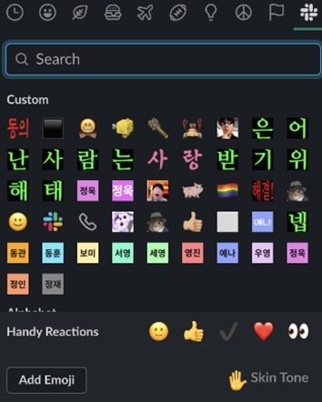 맥에서 지원하는 기본 이모지들뿐만 아니라 슬랙에서 제공하는 자체 이모티콘, 나아가 슬랙 사용자가 직접 이모지를 만들어 적용시킬 수도 있다.