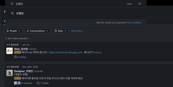 슬랙은 검색 기능을 통해 이전에 진행한 대화 내용을 쉽게 검색할 수 있다. 특히 모든 텍스트 내용이 저장되는 슬랙은 오래전에 나눴던 대화 내용을 저장하기 때문에 예전에 나눈 대화 내용들을 쉽게 찾을 수 있으며 필요한 파일 혹은 문서를 검색 기능으로 빠르고 쉽게 찾을 수 있다.