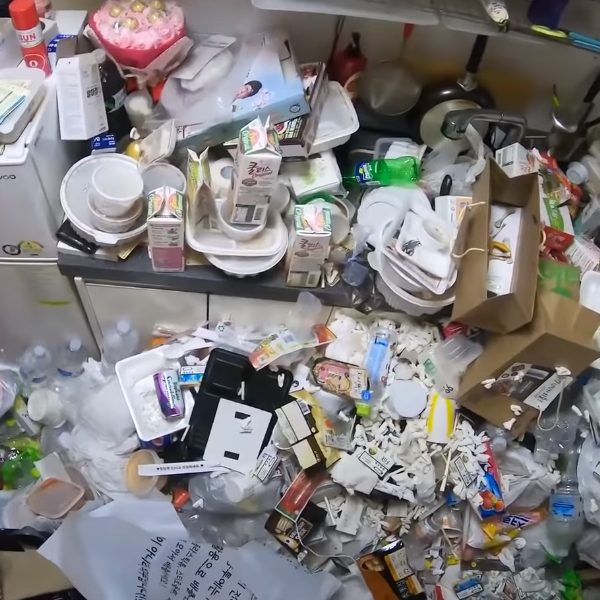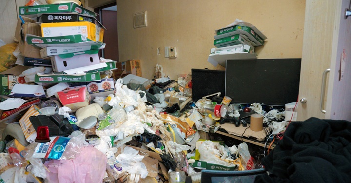 프라이팬에는 기름 낀 음식물이 말라붙어 있고, 유리컵 바닥엔 푸른곰팡이가 피었다. 주방에서 침대까지 거리는 열 걸음도 채 되지 않지만, 발 디딜 틈이 없어 한 발자국마다 공백을 찾아야 한다. 피자, 치킨, 떡볶이, 광어회 등 온갖 종류의 배달 음식이 박스 그대로 널려있고 어떤 봉지에는 구더기도 꼬여 있다. 날파리가 좁은 열 평짜리 방을 쉴 새 없이 날아다닌다.