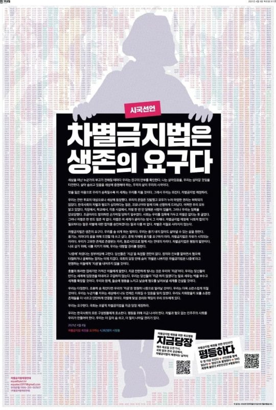 지난 4월 8일 자 한겨레신문에 ‘차별금지법은 생존의 요구다’라는 광고가 4,382명의 이름으로 11면 전면에 실렸다. 이 광고가 아니더라도 차별금지법에 대한 논란은 현재진행형이다. 이제 차별금지법은 사회 소수자들의 요구로만 이해되는 것이 아니라 우리 사회가 어떻게 나아가야 하는지에 대한 지표로 논란이 됐다.
