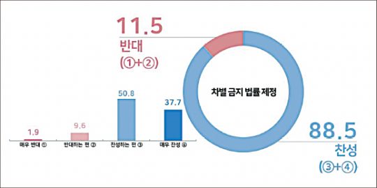 하지만 사회적 인식은 많이 변화해서 실제 여론조사로는 찬성이 압도적이다. 2020년 4월 국가인권위원회가 조사한 결과를 보면 80%가 넘는 사람들이 차별금지법에 대해 찬성하는 것으로 나타났다.