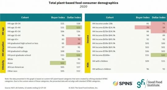 PBFA와 GFI는 매장 내 매출뿐 아니라, 소비자 조사를 통해 슈퍼에서 식물 기반 식품 소비계층도 알아봤다. 그 결과 소득 3만 5,000달러 미만 가구가 식물 기반 식품을 가장 적게 소비하는 반면, 전체 매출의 절반 이상이 소득 7만 달러 이상의 가구에서 발생했다고 한다(미국의 가계 소득은 중간값은 6만 8,703달러다). 식물 기반 식품을 가장 많이 소비하는 계층은? 연령대로는 35–44세, 교육수준으로는 대학원을 나온 소비자, 자녀가 있는 가구, 소득 10만 달러 이상인 가구였다.