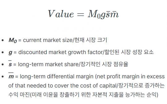 여기서 C는 고정비용(Fixed Cost)이다. [C/Leader Sales]는 고정비용의 중요성을 말해주고, 또 [(Leader Sales)/(Follower Sales) - 1]는 규모의 중요성을 말해준다. 전자는 시장의 구조에서 발견할 수 있는 스케일의 영향력을 설명하고, 후자는 리더의 포지션은 팔로워(경쟁사)에 비례한다는 것을 설명한다.