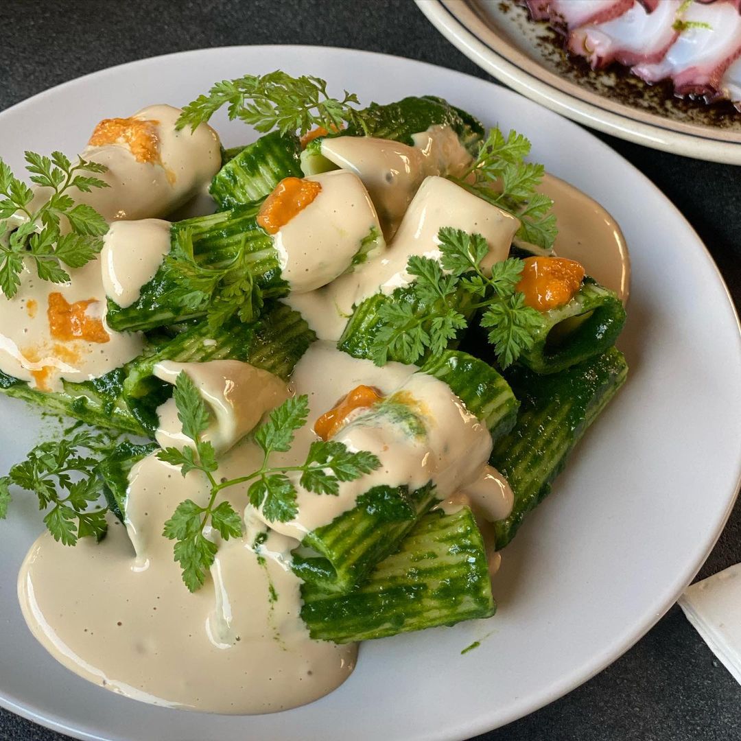 한옥을 개조한 널찍한 홀과 시원하게 트여진 천장이 반겨주는 퓨전 한식 주점 ‘익선반주’. 대표 메뉴는 쫄깃한 리가토니에 성게 알 소스와 방풍나물 퓌레로 산뜻한 색감을 더한 ‘성게장 콜드 파스타’. 향긋한 풍미가 퍼지는 방풍나물 퓌레에 성게 알의 녹진함, 참기름의 고소함이 어우러지며 다채로운 맛을 선사한다.