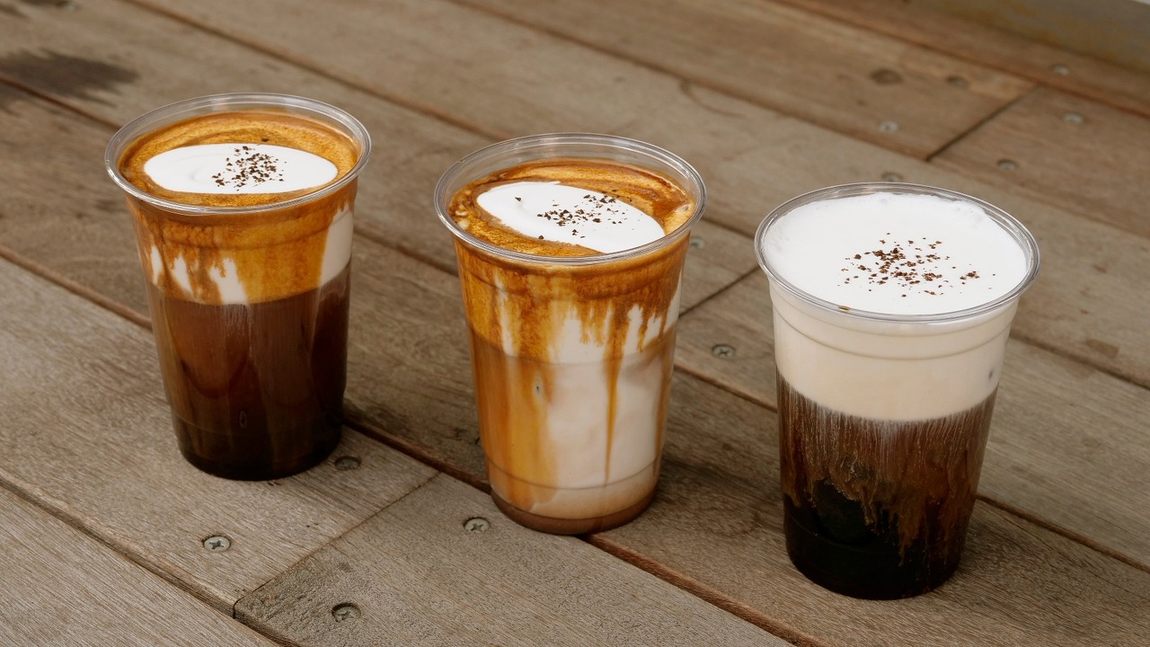 블랙 톤의 베이스에는 콜드브루와 카카오 등 다양한 재료가 배합되어 씁쓸하고도 오묘한 맛을 낸다. 여기에 코코넛밀크가 섞여 달콤하고 묵직한 하얀색 크림을 얹었다. 단쓴단쓴한 맛을 느낄 수 있는 조합이다.