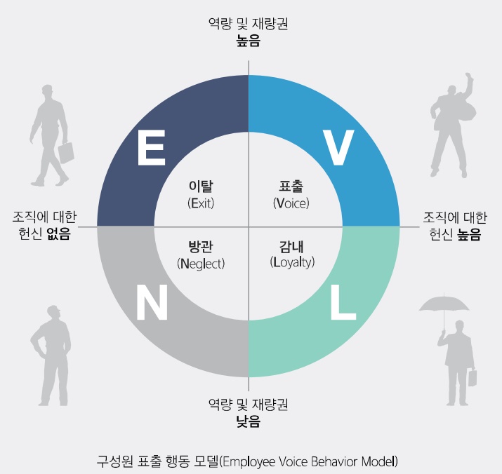 우리는 상대를 깊이 아끼는 헌신과 상대가 나의 말이나 행동으로 변화하리라는 믿음이 있을 때 자신의 의견을 적극적으로 표출합니다. 물론 여기엔 가짜 표출(pseudo-voice)도 있습니다. 실제로는 조직에 대한 헌신도 변화의 의지도 없으면서 말로만 떠드는 부류들입니다. 한마디로 속은 방관자지만 겉은 표출자인 사람들입니다.