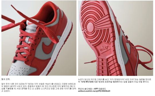 푸시를 보낸 쇼핑 앱 솔드아웃은 무신사가 만든 한정판 마켓입니다. 한정판이니 당연히 비싸지 않겠습니까? 그러다 보니 판매 상품이나 브랜드에 대한 이해 없이는 구매 전환이 쉽지 않았습니다. 하지만 나이키 덩크처럼 평소에 잘 알지 못했던 내용을 알게 되니까 자연스레 구매 욕구로 연결되더라고요. 정말 필요한 형태의 콘텐츠를 적절하게 만들고, 이를 알리는 방식까지 무신사는 역시 커뮤니티 기반 커머스답게 콘텐츠도 잘 만들고 잘 활용하는 것 같습니다.
