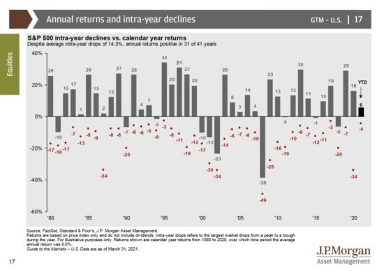 2020년의 경우, 34%의 급락이 있었지만 16% 상승으로 한 해를 마무리했다. 역사적 반전 같은 상황이었지만, 그런 상황은 우리가 상상하는 것만큼 드문 일이 아니다. 2019년에는 주가가 한때 7% 하락했지만 29% 상승으로 한 해를 마무리했다. 2016년의 경우, 한때 11% 하락했지만 10% 상승으로, 2014년에는 10% 한때 7% 하락했지만 11% 상승으로 한 해를 마무리했다.