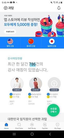 처음에는 무료 앱으로 외국어를 공부했다. 부담은 없는데 누가 챙겨주지 않으니 금세 포기하게 됐다. 그러다 비대면 개인 회화 과외를 중개해주는 앱 ‘과탑’을 알게 되었다.