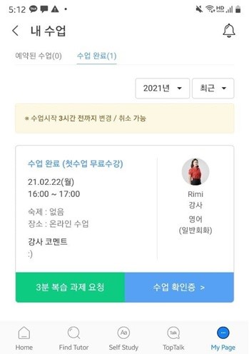 요약하면 이 앱은 정말 좋다. 우선 1대1 과외다. 대개 영어 인강은 헬스장처럼 1년 권 끊고 놀게 된다. 반면 과탑은 1:1로 선생님과 약속을 하기에 쉽게 빠질 수 없는 PT와 같다. 그런데 그 선생님이 베테랑이다. 심지어 가격도 합리적이다. 혹시나 선생님이 안 맞을지 걱정하지 않아도 된다. 나와 맞는 선생님을 직접 고를 수 있고, 최악의 경우 어차피 1시간은 무료다.