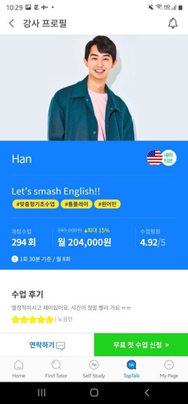 마음에 드는 강사를 찾아 수업을 신청할 수도 있지만, 앱에서 추천을 받을 수도 있다. 내 나이, 외국어 학습의 목적과 내 수준, 가능한 시간 등을 써 놓으면 적절한 강사를 추천해준다. 강사가 나와 수업 방식이 맞는지 궁금할 때는, 채팅을 통해 미리 문의할 수 있다. 그래도 혹시나 맞지 않을 때를 대비하여, 과탑에서는 첫 수업 1시간 시범 과외를 무료로 진행할 수 있다.