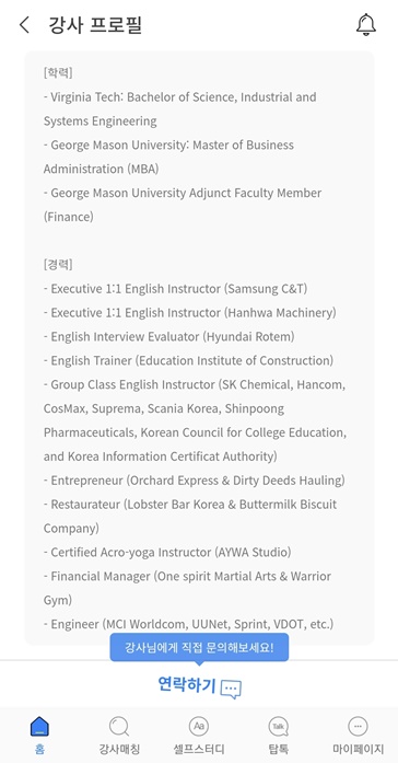 강사들의 이력도 화려하다. 삼성 등 대기업은 물론 W호텔 등 업계 톱 수준의 업체에서 영어 교육을 전담하던 강사도 있고, L어학원, O어학원 등 유명 어학원 경력도 기본이다. 원어민 강사에 번역가/통역사까지 강사로 등록되어 있어 필요와 수준에 따라 최적의 강사를 매칭받을 수 있다.