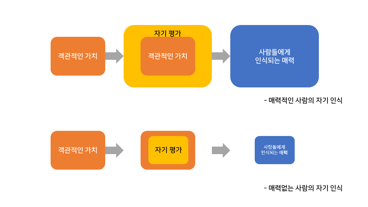 결국 자신감이 매력의 핵심이라면, 우리는 자신의 가치를 높게 바라보는 것으로 매력을 키울 수 있다는 결론이 납니다. 자신의 객관적인 가치보다 자신을 더 긍정적으로 평가할수록 매력의 크기는 더 커질 수 있겠지요. 그러나 이 글을 보는 분들은 너무나 자연스럽게 "그래도 되나…?" 하는 두려움이 생길 것입니다.