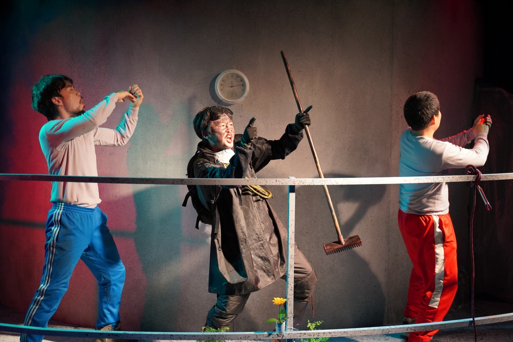 그들이 편하게 볼 수 있어야 하기 때문에, 이 극은 부조리극이 된 것이다. <고도를 기다리며>의 껍데기를 둘러쓰게 된 것이다. 그렇기 때문에 괴로운 굴뚝 위에서의 나날은 우스꽝스러운 대화와 율동이 되고, 노동자들이 노동하는 모습은 오락적인 춤이 된 것이다.