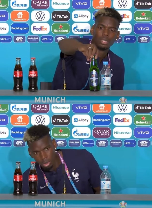 호날두의 자기 관리에는 (킨더초콜릿을 빼고) 자비가 없기 때문이다. 그는 건강을 위해서 물을 마시라는 메시지를 전달하였다. 뒤이어 포그바는 다른 후원사인 하이네켄의 무알콜 맥주를 책상 아래에 내려놨다(그가 술을 마시지 않는 무슬림이었기 때문이다). 로카텔리는 코카콜라를 옆으로 치우고 하이네켄 상표를 뒤로 돌렸다. 스포츠 마케팅계에서 전설인 코카콜라와 하이네켄은 식은땀을 흘려야 했다.